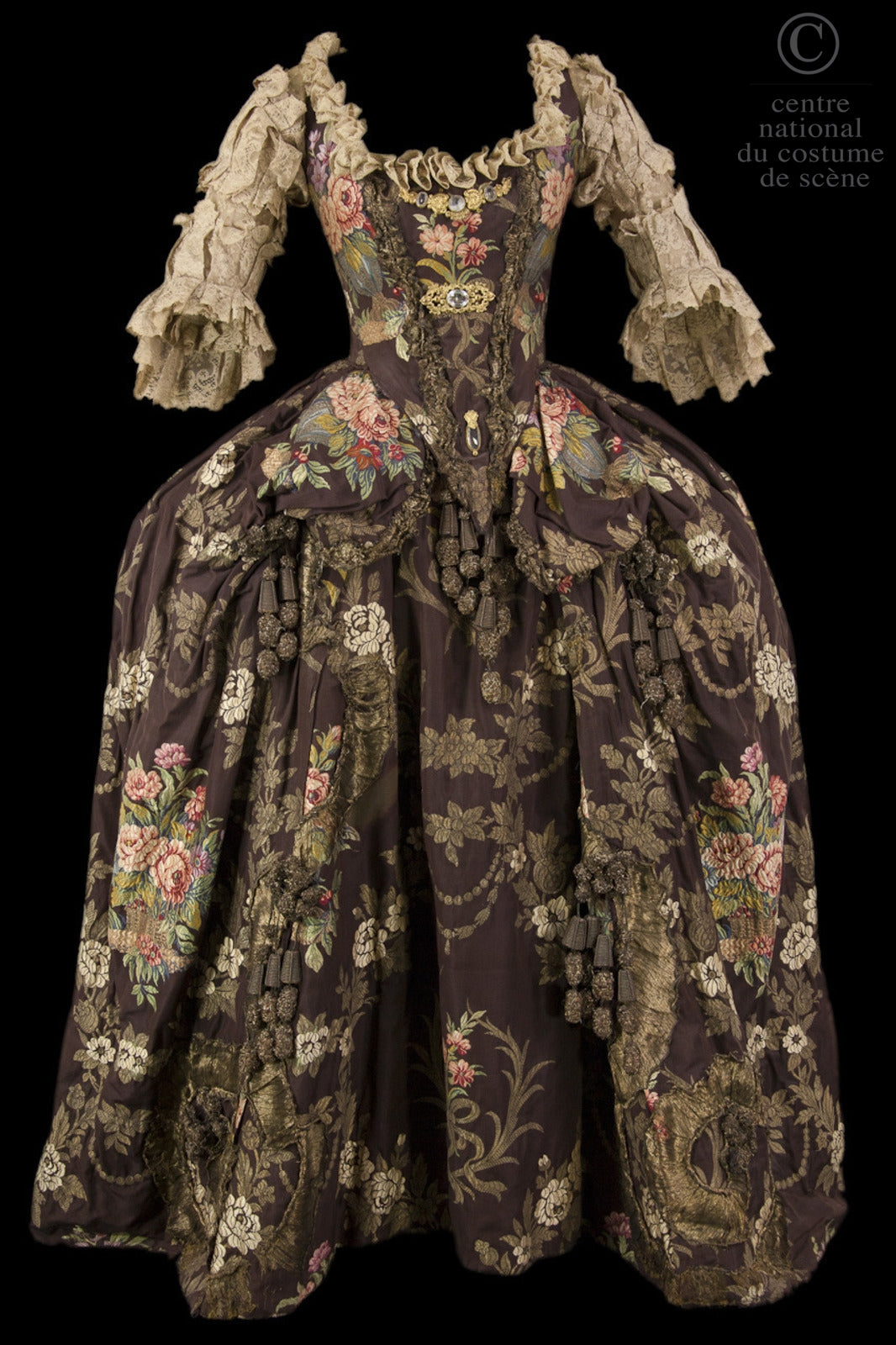 Description :  XVIII's style dress with brocard brown motifs and lace details. Corset with jewels